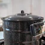 Water bath canner – A water bath canner is a large pot for boiling canning jars. Most canners are stainless steel, enamel-coated stainless steel, or aluminum, with a size ranging from 21 to 33 quarts. The larger the canner, the more jars it can hold, with the standard 21-quart canner holding 7 quart-sized jars and 8-9 pint jars. Canners must be deep enough to accommodate your jars sitting on the canning rack with enough water to cover the jars more than one full inch.