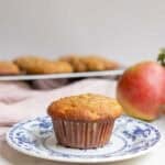 Moist, fluffy, and delicious – Between the mashed banana and the Greek yogurt, this muffin recipe is moist with a tender crumb. The butter, dark brown sugar, and vanilla work harmoniously with the banana and apple to create a delicious and very flavorful muffin.